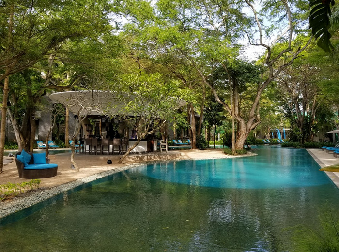 Foto ini diambil dari balkon business center Courtyard Marriott hotel Nusa Dua, Bali. Pohon-pohon dan gedung hotel yang tinggi menciptakan shade kontras dengan matahari yang menerangi kolam renang, yang membuat kamera smartphone akan sulit menangkap detail dan warna dari batang-batang dan dedaunan pohon.