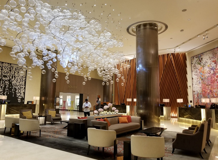 Lobi hotel Fairmont Singapore ini menarik, karena hiasan bola-bola di langit-langitnya. Penerangan di lobi hotel biasanya cukup, tidak terlalu terang dan memiliki ambien cahaya kekuningan, karena warna kekuningan ini membantu mood untuk lebih rileks. Kebanyakan lampu di lobi hotel berupa lampu indirect atau spot, hanya menerangi bagian-bagian aksen tertentu.