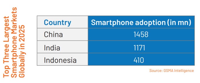 MMA memprediksi jumlah pengguna smartphone di Indonesia pada tahun 2025 akan mencapai 410 juta pengguna, mengikuti China (1469 juta) dan India (983 juta) sebagai tiga besar pasar ponsel pintar secara global.