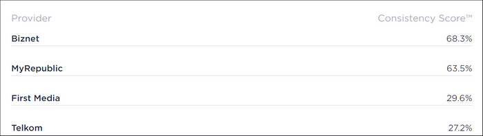 Dalam mengukur konsistensi kinerja masing-masing penyedia fixed broadband, Ookla menemukan bahwa kecepatan internet Biznet memiliki Consistency Score tertinggi di Indonesia selama Q3 2021, dengan 68,3% hasil menunjukkan kecepatan download minimal 25 Mbps dan kecepatan upload minimal 3 Mbps.