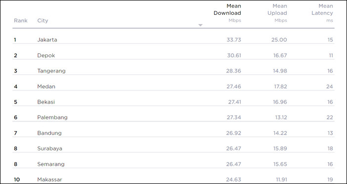 Sedangkan Jakarta memiliki kecepatan pengunduhan fixed broadband rata-rata tercepat di antara kota-kota terpadat di Indonesia pada 33,73 Mbps, sementara Makassar mencapai kecepatan pengunduhan seluler rata-rata tercepat pada 25,30 Mbps.
