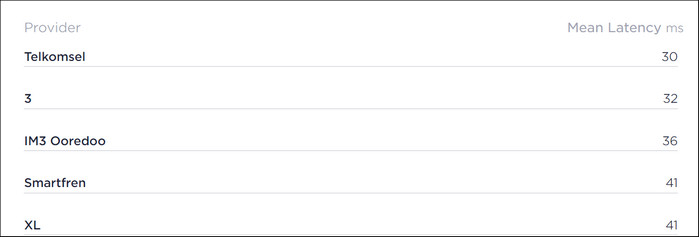 Ookla juga menghitung rata-rata latensi untuk penyedia seluler teratas di Indonesia selama Q3 2021. Hasilnya, kecepatan internet Telkomsel memiliki latensi terendah pada 30 ms.