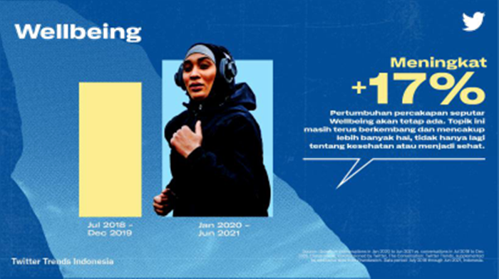 Orang Indonesia mendefnisikan kembali arti kesejahteraan bagi mereka, mulai dari menjaga kesehatan mental hingga memprioritaskan perawatan diri. Pertumbuhan percakapan seputar well-being mencapai (+17%) di Twitter.