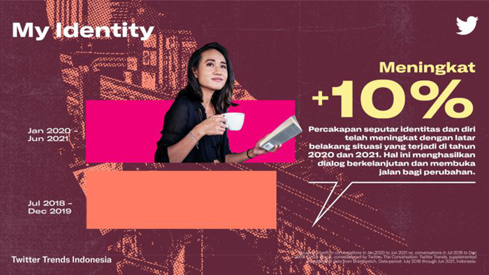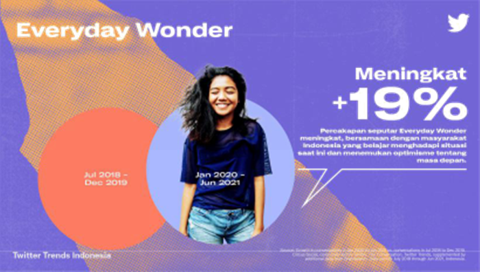 Dengan menganalisa Tweet selama tiga tahun terakhir (Juli 2018 – Juni 2021), Twitter mendalami percakapan yang terjadi di Indonesia. Mulai dari apa saja yang dibicarakan hingga beragam tren percakapan di Twitter di Indonesia yang muncul akhir-akhir ini.