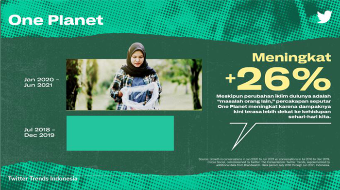 Percakapan tentang One Planet meningkat 26% dengan Next to Nature (+39%) dan Environment Urgency (+19%) sebagai sub-pilar teratas dari tren ini.