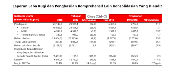 Penurunan ini terjadi akibat oleh adanya transformasi industri telekomunikasi melalui penerapan peraturan registrasi Sim Card yang memicu persaingan ketat antar operator pada semester 1 tahun 2018 lalu.