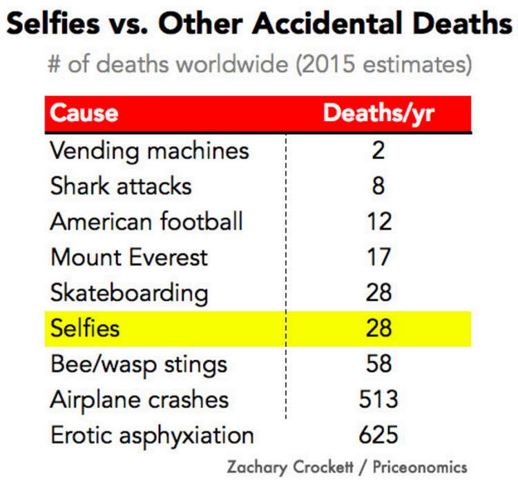 Mengingat selfie telah banyak merenggut nyawa di sepanjang tahun 2015, maka Anda perlu lebih berhati-hati dan jangan mengabaikan keamanan jika suka selfie di ketinggian. Di bawah ini Anda bisa melihat data korban selfie yang dirilis Priceonomics.