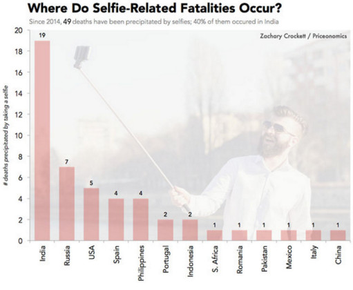Sementara itu, India menjadi negara yang paling banyak menjadi korban meninggal akibat selfie. Di Negeri Bollywood ini tercatat ada 19 orang meninggal akibat selfie di tahun 2015. Rusia menjadi negara terbanyak kedua dengan 7 korban jiwa, kemudian Amerika Serikat dengan 5 korban, dan Spanyol dengan jumlah korban 4 orang.