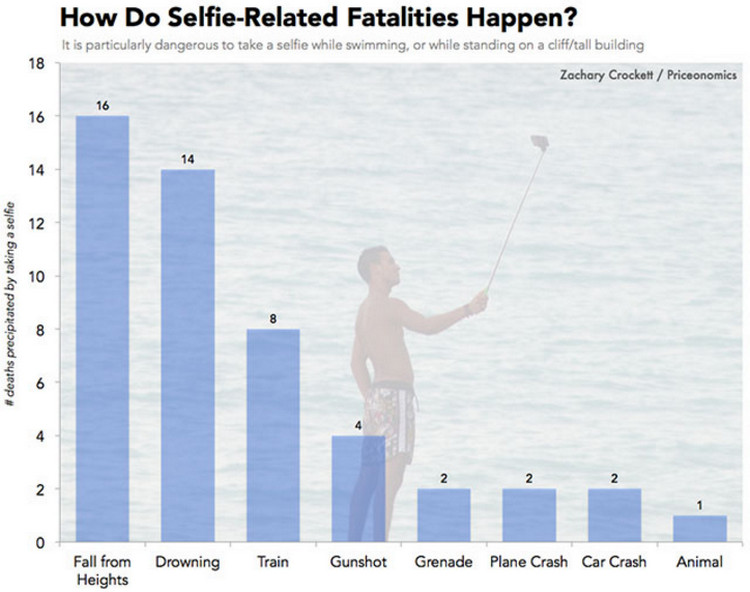 Menurut studi yang dirilis Priceonomics, korban meninggal akibat selfie paling banyak terjadi karena terjatuh dari ketinggian. Disebutkan, setidaknya ada 16 orang meninggal akibat terjatuh dari ketinggian saat melakukan selfie di sepanjang tahun 2015.