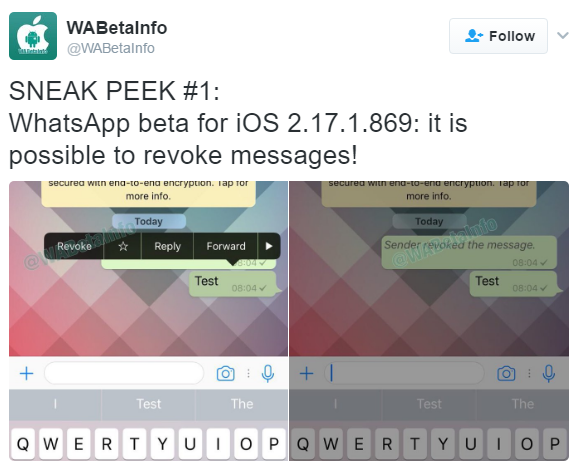 Selain Revoke, aplikasi messaging milik Facebook itu juga sedang menguji fitu lainnya yang baru, yakni Edit yang memungkinkan penggunanya untuk mengubah pesan yang telah terkirim ke teman chatting-nya. Fitur baru dari WhatsApp ini pertama kali muncul setelah adanya bocoran screenshot tampilan WhatsApp beta untuk iOS dengan versi 2.17.1.869 yang diposting oleh akun @WABetaInfo.