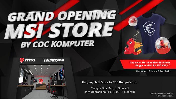 Selain itu, tersedia juga promosi Bundle Deals dan promosi Jantastic yang dibanjiri berbagai hadiah menarik hingga 31 Januari 2021. Peresmian MSI Store by COC Komputer diresmikan pada tanggal 15 Januari 2021.