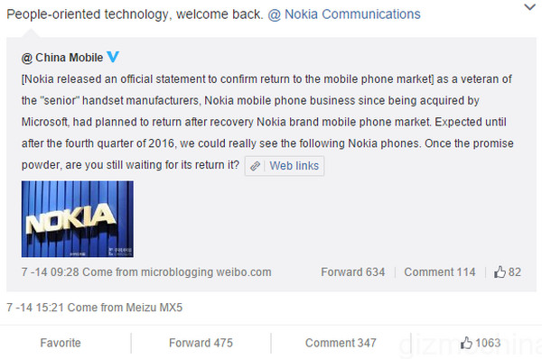 Petunjuk ini datang dari daratan Tiongkok, lebih tepatnya dari laman akun resmi Weibo Meizu. Vendor ponsel asal Tiongkok ini menuliskan ucapan selamat datang kembali kepada Nokia. Pesan yang dituliskan Meizu ini cukup mencurigakan. Ditambah lagi, Meizu juga memposting sebuah teaser