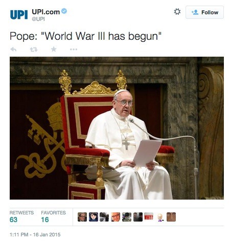 JAKARTA – Akun Twitter dua media ternama, United Press International (UPI) dan New York Post diretas pada Jumat lalu. Tweet yang beredar menyebutkan bahwa Amerika Serikat dan China memulai perang di laut dan Paus Fransiskus mengumumkan mulainya Perang Dunia III.