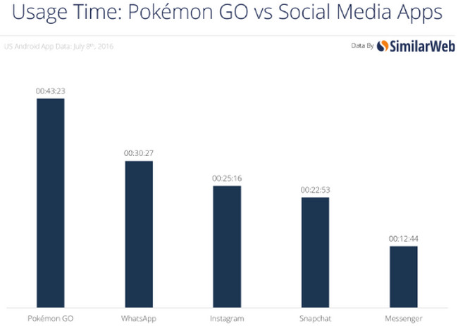 Laporan SimilarWeb menyebutkan bahwa durasi waktu yang dihabiskan pengguna Pokemon Go setiap harinya mencapai 43 menit 23 detik pada tanggal 8 juli. Sebagai perbandingan, WhatsApp, Instagram, Snapchat dan Facebook Messenger masing-masing tidak lebih dari 30 menit setiap harinya.