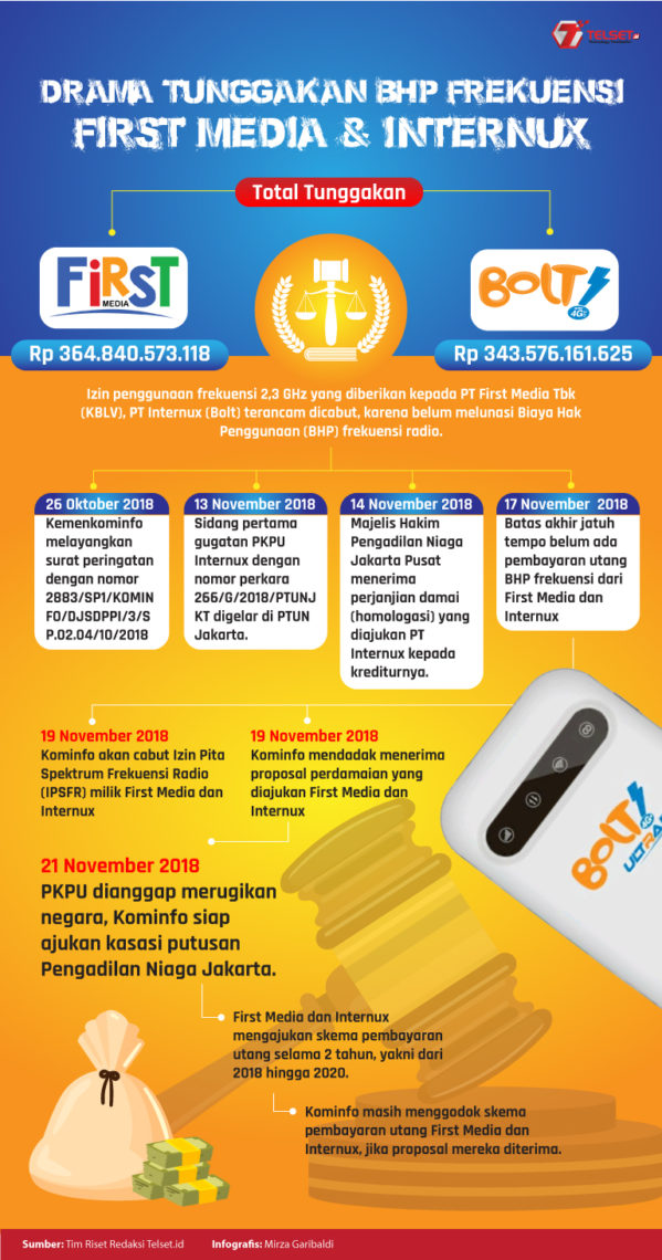 Hingga kini Kementerian Kominfo masih mempertimbangan proposal perdamaian yang diajukan PT First Media Tbk dan PT Internux (Bolt). Menurut Ferdinandus Setu, proposal tersebut menawarkan skema pembayaran tunggakan dengan mencicil selama 2 tahun, dan akan dimulai bulan Desember 2018.