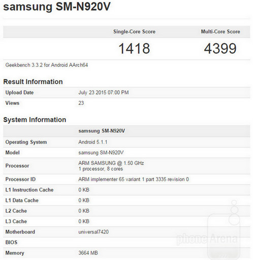 Galaxy Note 5 terlacak muncul di Geekbench pada 23 Juli sebagai versi Verizon Wireless dengan nomor model SM-N920V. Perangkat ini terungkap menggunakan chipset 64-bit Exynos 7420 dengan fitur prosesor octa-core, dan kapasitas RAM 4GB