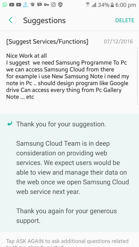 Seperti yang bisa Anda lihat pada gambar di atas, raksasa Korea Selatan tersebut tampaknya membalas saran dari anggota, dimana tim Samsung Cloud sudah mempertimbangkan secara mendalam atas saran tersebut. Tentu diharapkan layanan Samsung Cloud bisa hadir untuk Web pada tahun 2017 mendatang, agar dapat bersaing dengan layanan cloud yang sudah terlebih dahulu hadir.