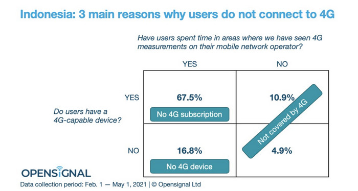 Data OpenSignal menunjukkan 67,5% 3G-only users di Indonesia mempunyai smartphone berkemampuan 4G, dan mereka menghabiskan waktu di area yang terjangkau oleh 4G tapi tidak menggunakan jaringan 4G.