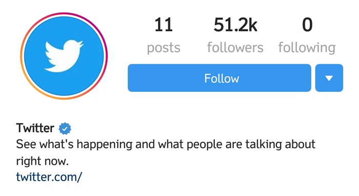 Akun resmi Twitter di Instagram sendiri hingga kini sudah memiliki 51,2 ribu followers dan sama sekali tidak mengikuti siapapun. Tak hanya itu, Twitter juga bahkan sudah mencoba fitur Stories di Instagram dan juga telah membagikan 11 postingan.