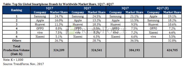 TrendForce juga memperkirakan bahwa Samsung akan berada tepat di bawah Apple dengan pangsa pasar sebesar 18,2 persen, atau menurun sekitar 2,9 persen dari kuartal III 2017.