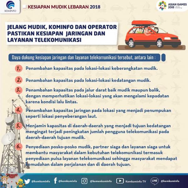 “Kesiapan jaringan dan layanan telekomunikasi sangat memperhatikan peningkatan dan pergerakan trafik saat arus mudik dan arus balik Lebaran Idul Fitri Tahun 2018 serta saat pengguna layanan telekomunikasi berada di daerah tujuan,” ujar Ramli dalam keterangan resminya di Jakarta, Rabu (6/6/2018).