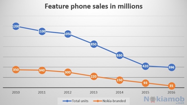 Total penjualan feature phone di tahun 2016 lalu menyentuh angka 396 juta unit. Meski terbilang masih banyak, tapi perolehan tersebut terus menurun secara perlahan dari tahun 2010 hingga saat ini.