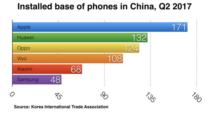 Tren pasar di Negari Tirai Bambu itu menunjukkan bahwa pelanggan lebih suka membeli smartphone yang lebih murah buatan merek lokal. Menurut Korea International Trade Association (KITA), Samsung telah menjual 48 juta smartphone pada kuartal kedua tahun ini. Apple memegang posisi pertama dengan pengiriman 171 juta iPhone pada Q2 2017.