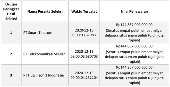 Pelaksanaan penentuan peringkat melalui aplikasi pencatatan waktu telah dilaksanakan dengan diikuti oleh 3 peserta seleksi yakni PT Telekomunikasi Selular (Telkomsel), PT Smart Telecom (Smartfren) dan PT Hutchison 3 Indonesia (Tri Indonesia).