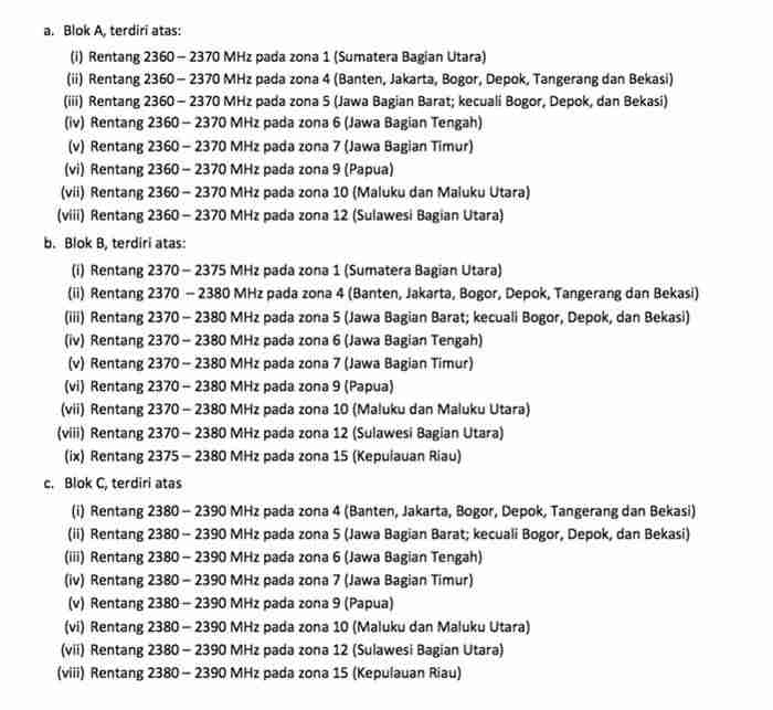 Sementara Telkomsel berhak atas blok C yang terdiri dari 9 zona. Sedangkan Hutchison 3 Indonesia mengisi blok B yang terdiri dari 8 zona.