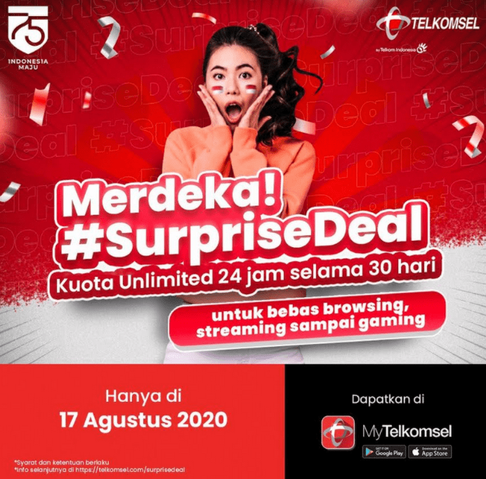 “Sebagai apresiasi kepada pelanggan dan dalam rangka memeriahkan makna kemerdekaan Republik Indonesia tahun ini, Telkomsel menghadirkan paket khusus yaitu #SurpriseDeal,” tulis Telkomsel dalam keterangannya yang diterima Telset.id, Senin (17/8/2020).