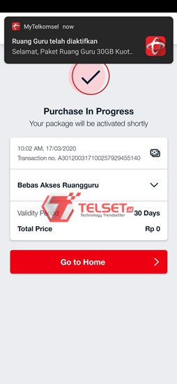 Di sana, terdapat paket “Bebas Akses Ruangguru” yang tersedia secara gratis. Tekan paketnya, kemudian tekan tombol Buy. Otomatis, paket akan aktif dan pengguna bisa akses Ruangguru selama 30 hari dengan menggunakan kuota 30GB gratis dari Telkomsel.