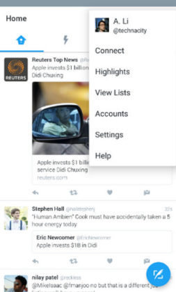 Hal ini terjadi selama pengujian A/B, di mana dua versi yang berbeda dari aplikasi yang sedang diuji untuk melihat mana yang lebih disukai pengguna. Dan Floating Action Buttons digunakan untuk menulis tweet baru.