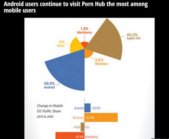 Menurut data Porn Hub yang telsetNews kutip dari PhoneArena, Minggu (11/1/2015), sekitar 49% pengunjung situs esek-esek itu adalah pengguna smartphone Android. Sementara pengguna iOS mencapai 40,2%, Windows 2,6% dan BlackBerry 1,4%.