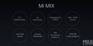 Mi MIX juga merupakan smartphone Xiaomi pertama yang tidak memiliki tombol kontrol apapun di bagian bawah (depan) yang dipindah ke bagian layar. Meski begitu, layar Mi MIX yang memiliki aspek rasio 17:9 ini masih bisa digunakan dengan maksimal (meskipun dipakai tombol kontrol di dalam layar menjadi 16:9).
