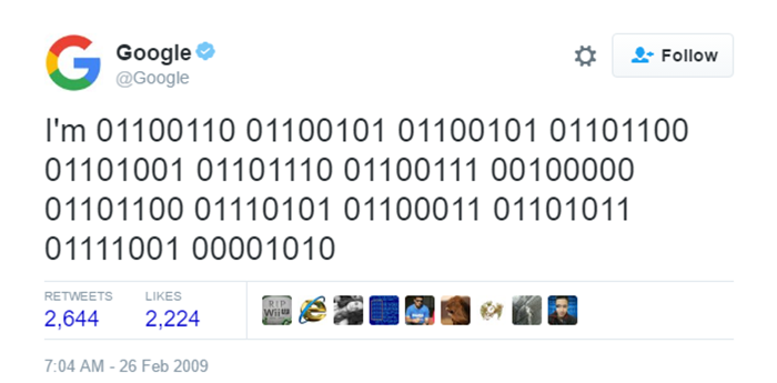 Anda tahu tweet pertama yang dikirimkan Google? Ternyata Tweet pertama Google cukup unik karena berbunyi “i’m 01100110 01100101 01100101 01101100 01101001 01101110 01100111 00100000 01101100 01110101 01100011 01101011 01111001 00001010,” Yang dikirimkan pada 26 Februari 2009 pada jam 7 pagi. Tapi apa sebenarnya arti dari bilangan biner yang diketikkan oleh Google pertama kalinya? Ternyata arti dari bilangan biner yang begitu panjang tersebut adalah “I’m feeling lucky,” yang menjadi tombol pada halaman utama di Google.