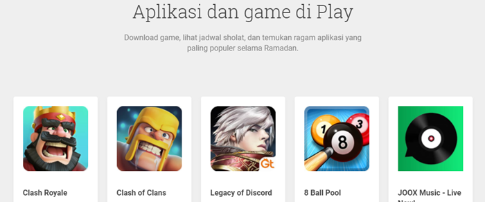 Terakhir, Google juga memberikan fitur di bulan Ramadhan ini khusus unutk para gamers. Dengan adanya fitur tersebut, para gamers bisa saling susul menyusul level dengan teman-teman yang nantinya bisa mendapatkan berbagai promo atau diskon khusus dari Google Play. Tak cuma itu saja, Google pun memberikan diskon khusus di bulan Ramadhan untuk game, aplikasi, dan lainnya yang bisa segera di-download untuk menjadi teman ngabuburit Anda.