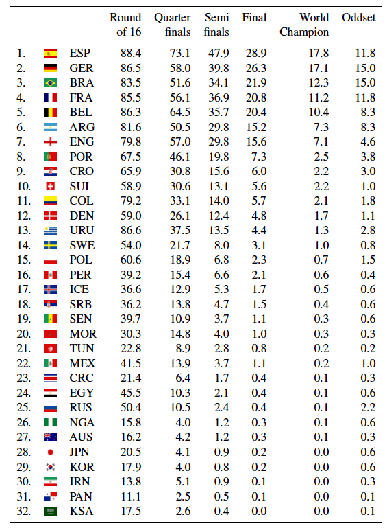 Spanyol punya peluang 17,8 persen menjadi juara dunia, sedangkan Jerman hanya terpaut tipis, yakni 17,1 persen. Di tempat ketiga ada Brasil dengan kesempatan menang 12,3 persen. Studi yang sama mengungkap Inggris punya peluang menjadi juara dunia sebesar 7,1 persen.