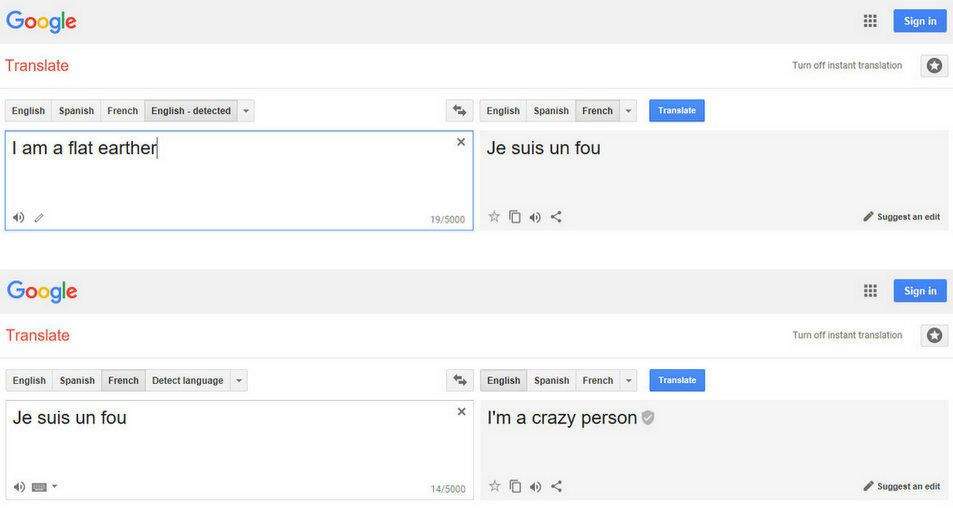 Menurut laporan CNET, ketika seseorang menulis kalimat “I am a flat-Earther” di Google Translate untuk diterjemahkan ke bahasa Prancis, hasilnya adalah “Je suis un fou”. Nah, kalau kalimat “Je suis un fou” diterjemahkan ke bahasa Inggris, artinya adalah “Saya orang gila”.
