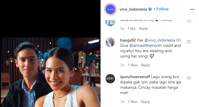 Terselip juga komentar unik dari akun @ipunchwerewolf yang justru mempromosikan lagu mereka dan memperbolehkan Vivo untuk menggunakannya.
