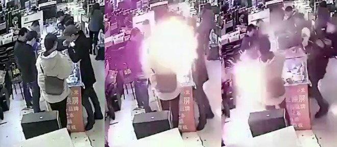 Melansir dari laman Apple Insider, detik-detik kejadian ini terekam oleh CCTV di daerah pertokoan di Tiongkok. Dalam video tersebut, terlihat sang korban berdiri di samping sebuah counter service smartphone, bersama seorang temannya dan penjaga toko. Dia berniat untuk mengganti baterai iPhone kesayangannya.