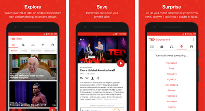 Berbicara mengawali hari, aplikasi TED talk merupakan medium yang sangat menarik untuk digunakan. Setidaknya di dalam aplikasi smartphone ini terdapat direktori video-video motivasi dari para ilmuwan, peneliti, entrepreneur, hingga musisi. Anda dapat menemukan sekitar 1400 TEDTalk video dan audio dari aplikasi resmi TED. Aplikasi yang dikembangkan oleh TED Conferences sendiri telah tersedia untuk perangkat tablet dan smartphone.