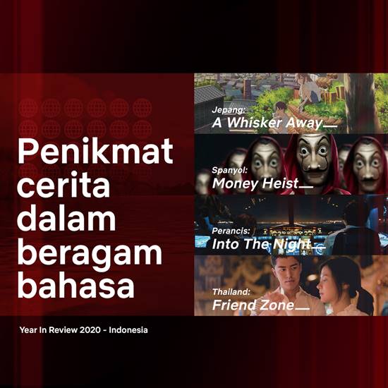 Serial bertema kriminal “Money Heist” yang hadir dalam bahasa Spanyol, fiksi ilmiah Belgia “Into the Night” yang hadir dalam bahasa Prancis, film anime “A Whisker Away”dari Jepang, serta “Friend Zone”, asal Thailand, juga berhasil mencuri hati penonton.