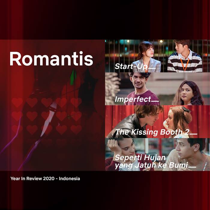 Karakter penonton pertama adalah karakter Romantis. Minimnya interaksi secara langsung dengan satu sama lain dan sulitnya berkencan di 2020 membuat tayangan romantis di Netflix sangat digemari sepanjang tahun ini.
