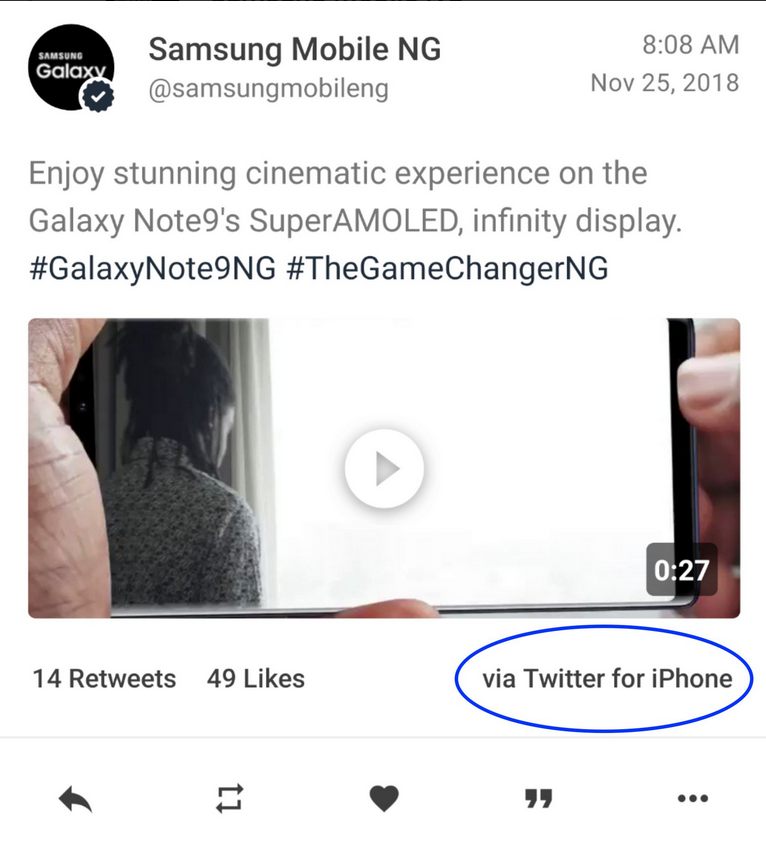 Pasalnya, pada sisi kanan bawah terlihat tulisan “Via Twitter for iPhone” yang membuktikan jika admin Samsung menggunakan iPhone untuk mempromosikan Galaxy Note 9.