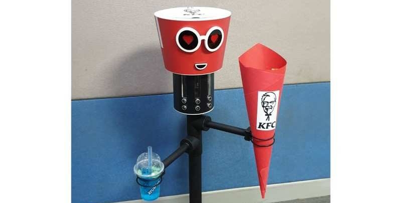 KFC Bucket Bae memiliki sensor bawaan plus kaki roda yang tersembunyi di bagian bawahnya agar dapat mengikuti konsumen ke meja makan, sembari membawa pesanan mereka.