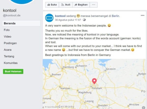 “Kami memahami arti kontol dalam bahasa Anda. Dalam bahasa Jerman Konto artinya akun dan Tool artinya alat. Ketika kami akan datang dengan produk kami ke pasar anda (Indonesia), saya pikir kita harus menemukan nama baru. Tapi pertama-tama kita harus menaklukkan pasar Jerman. Salam terbaik untuk Indonesia dari Berlin di Jerman,” tulis akun Facebook Kontool.
