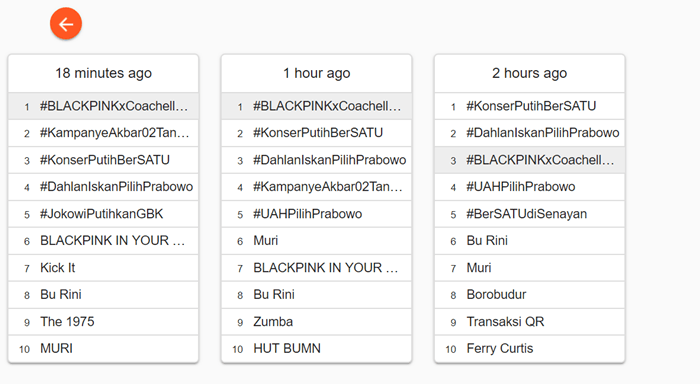 Berdasarkan pantuan Tim Telset.id dari Trends24.id pada Sabtu (13/04/2019), tagar #KonserPutihBerSATU berada di posisi puncak di laman Twitter. Tagar tersebut sudah ramai sejak pagi dan sempat berada di urutan pertama sekitar pukul 10.00 WIB.