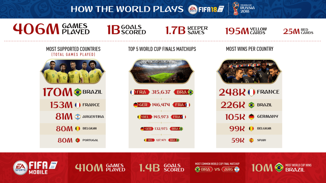 Melalui sistem ini, EA Sports menghitung statistik dari 406 juta pertandingan di game virtual. Game virtual itu dimainkan oleh para pemain FIFA 18. Hasilnya, Perancis jadi tim yang paling banyak mengoleksi kemenangan dengan jumlah 248 ribu. Brasil menghuni posisi dua dengan jumlah kemenangan 226 ribu.