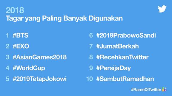 Berikut adalah urutan tagar atau tanda pagar (#) paling banyak di linimasa Twitter pada 2018.