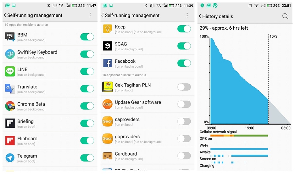 Walaupun belum bisa se-otomatis Android Marshmallow, pada Pureshot+ melalui VIsion UI nya kita bisa memanfaatkan fitur yang mirip – walau harus ditetapkan secara manual – melalui menu setting security yang dinamakan Self-running management. Setiap aplikasi yang kita anggap boleh autorun kita berikan ijin, dan aplikasi-aplikasi yang kita anggap tidak perlu jalan otomatis, kita matikan.